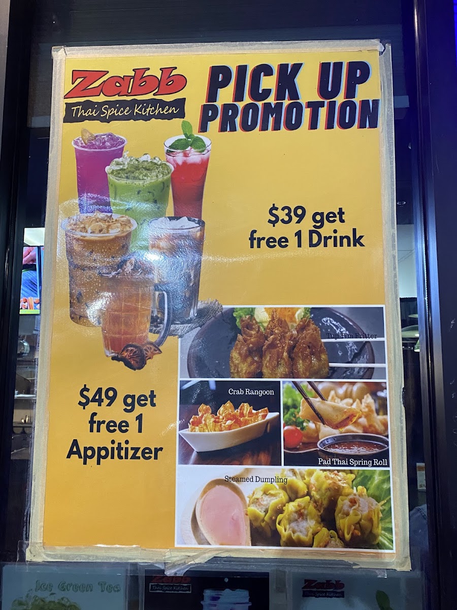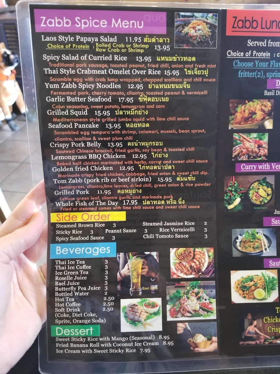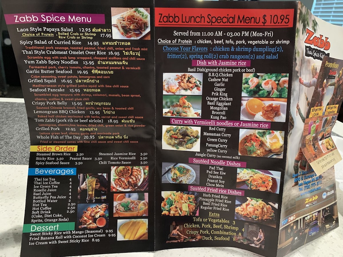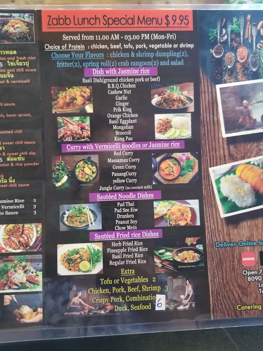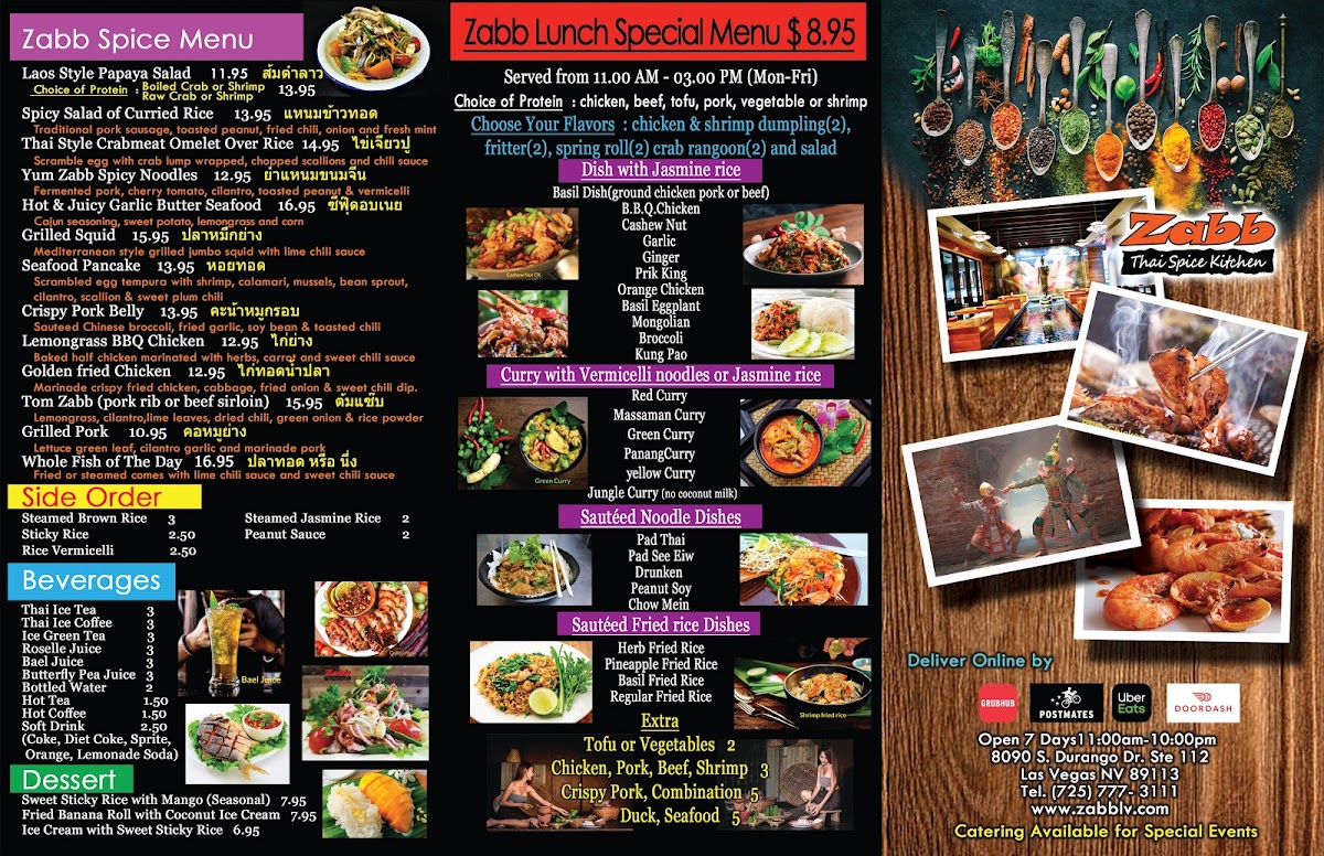 The menu at Zabb Thai Spice Kitchen offers a delightful range of authentic Thai dishes that cater to various tastes. Appetizers like Asian Steamed Dumpling and Coconut Crusted Shrimp give a great start to the meal, while their signature soups, such as Lemongrass Tom - Yum Soup and Coconut Tom - Kha, offer bold and flavorful broths. For salads, the Thai Papaya Salad and the spicy Larb (offered with chicken, pork, or beef) are standouts. Curry lovers can indulge in the rich, aromatic flavors of Red Curry, Green Curry, and Panang Curry, or explore the more adventurous Jungle Curry. For those craving rice, options like Herb Fried Rice and Pineapple Fried Rice are sure to satisfy, along with a variety of noodle dishes such as Pad Thai Noodle and Drunken Noodle. The Zabb Spice Menu offers bold flavors like the Laos Style Papaya Salad and Grilled Squid, adding a unique twist to the dining experience. Don't miss the signature sides, like Sticky Rice and Peanut Sauce, as well as beverages like Thai Ice Tea and refreshing Roselle Juice. For dessert, the Sweet Sticky Rice with Mango (seasonal) and Fried Banana Roll with Coconut Ice Cream offer a sweet and satisfying end to the meal. With a wide variety of options and vibrant flavors, Zabb Thai Spice Kitchen’s menu provides a comprehensive and delicious Thai dining experience.