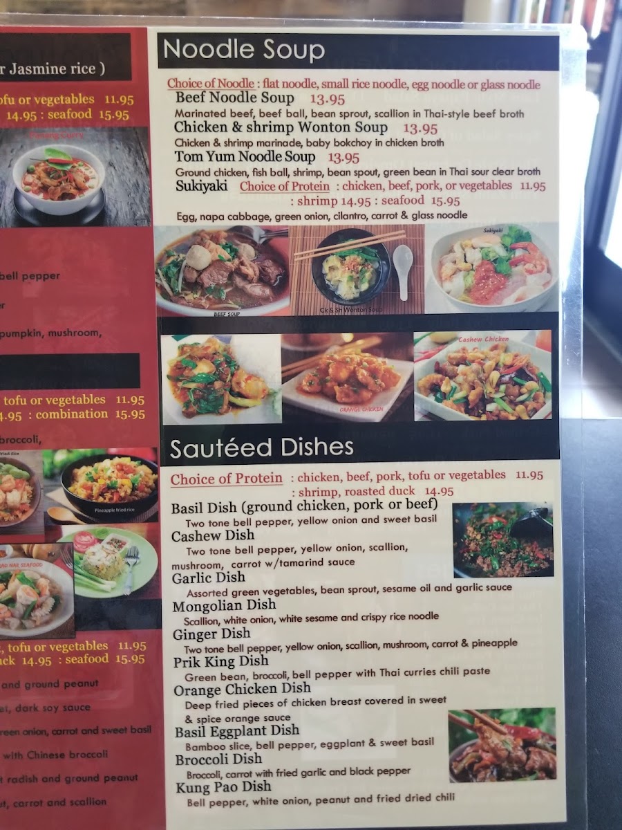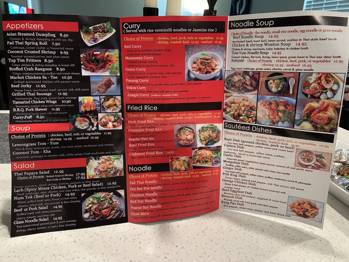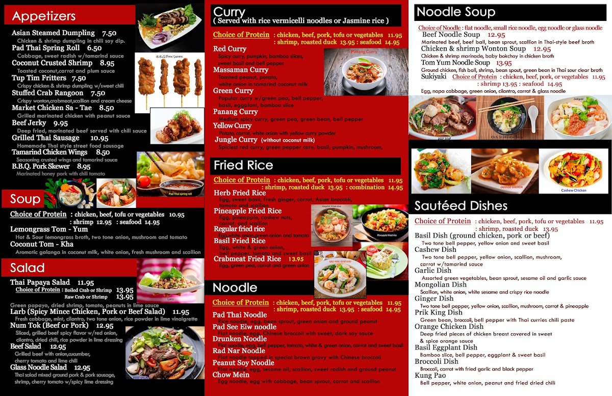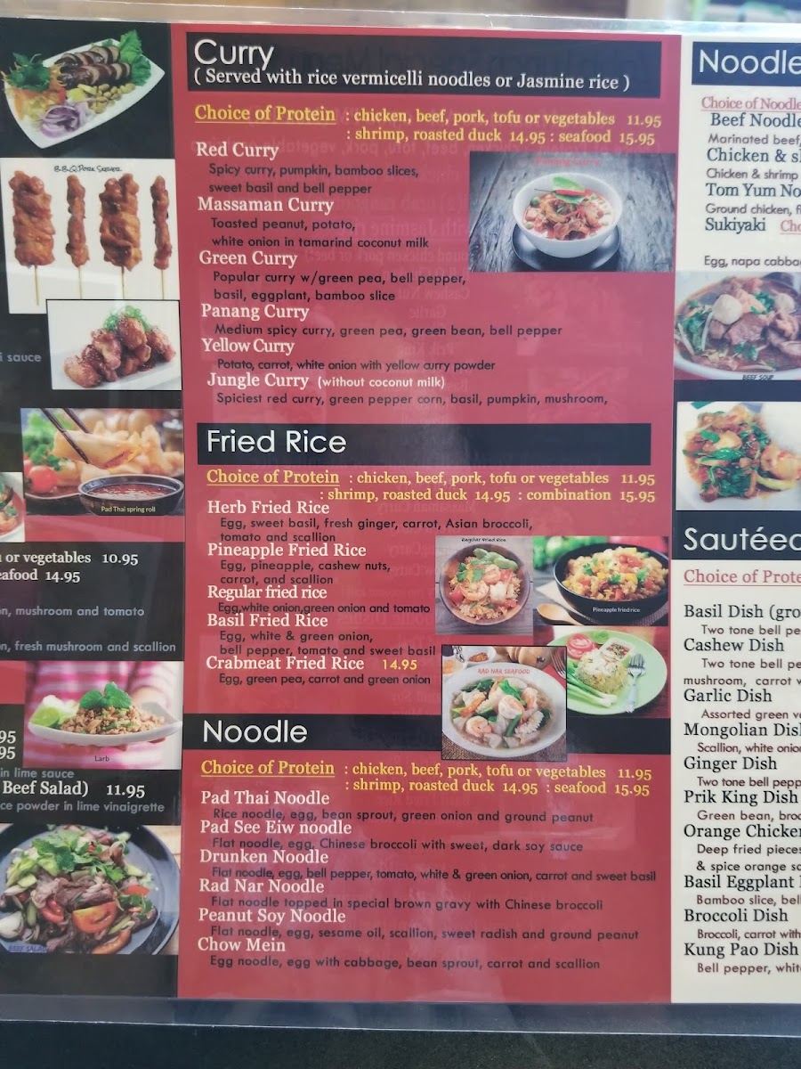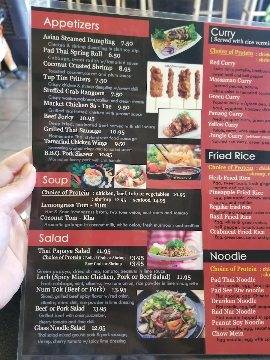 The menu at Zabb Thai Spice Kitchen offers a delightful range of authentic Thai dishes that cater to various tastes. Appetizers like Asian Steamed Dumpling and Coconut Crusted Shrimp give a great start to the meal, while their signature soups, such as Lemongrass Tom - Yum Soup and Coconut Tom - Kha, offer bold and flavorful broths. For salads, the Thai Papaya Salad and the spicy Larb (offered with chicken, pork, or beef) are standouts. Curry lovers can indulge in the rich, aromatic flavors of Red Curry, Green Curry, and Panang Curry, or explore the more adventurous Jungle Curry. For those craving rice, options like Herb Fried Rice and Pineapple Fried Rice are sure to satisfy, along with a variety of noodle dishes such as Pad Thai Noodle and Drunken Noodle. The Zabb Spice Menu offers bold flavors like the Laos Style Papaya Salad and Grilled Squid, adding a unique twist to the dining experience. Don't miss the signature sides, like Sticky Rice and Peanut Sauce, as well as beverages like Thai Ice Tea and refreshing Roselle Juice. For dessert, the Sweet Sticky Rice with Mango (seasonal) and Fried Banana Roll with Coconut Ice Cream offer a sweet and satisfying end to the meal. With a wide variety of options and vibrant flavors, Zabb Thai Spice Kitchen’s menu provides a comprehensive and delicious Thai dining experience.